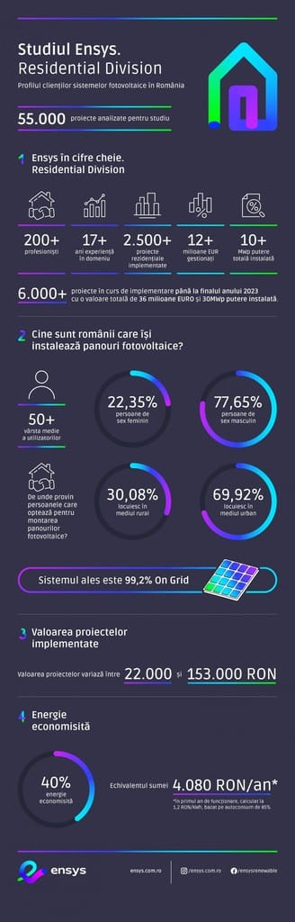 Compania Ensys Renewable Solutions, prin Divizia dedicată Sistemelor Rezidențiale, a realizat în luna aprilie 2023 un studiu pe baza datelor centralizate de la 55.000 de clienți persoane fizice, înscriși pentru instalarea sistemelor fotovoltaice atât prin programe guvernamentale subvenționate, cât și prin contribuție proprie.